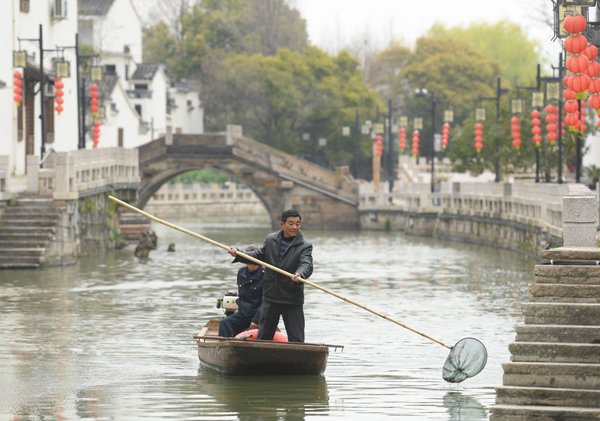 2023年3月16日,在太湖畔的浙江省湖州市织里镇义皋村,保洁员在清理河道。多年来的溇港整治使得太湖周边河道水质明显改善,也为乡村旅游注入动力。