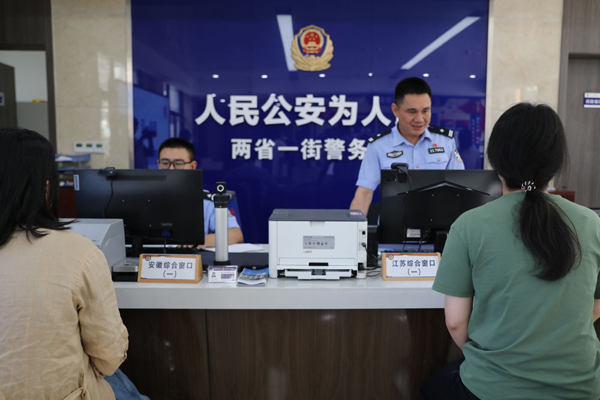 2023年6月2日,安徽的辅警(左二)和江苏的民警(右二)在丹阳警务室政务服务窗口为人们办理业务。安徽马鞍山博望区丹阳镇与江苏南京江宁区丹阳社区相毗邻,2023年年2月底,苏皖“两省一街”丹阳警务室政务服务窗口正式揭牌,在两地交界区域实体化运行。