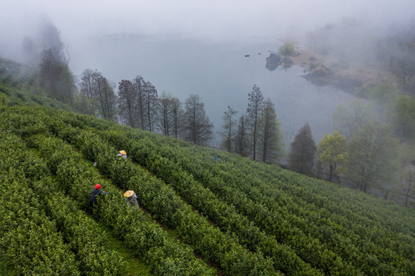 2024年4月7日,在位于浙江省金华市金华山鹿田村的婺州举岩茶基地,茶农在采摘举岩茶鲜叶,发展特色茶产业是推动当地百姓共富的重要途径之一(无人机照片)。